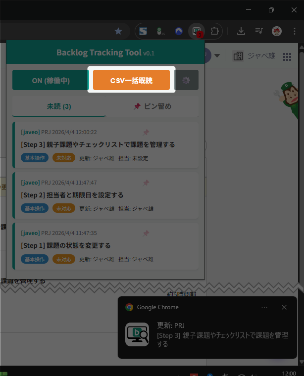 ポップアップの「CSV一括既読」ボタンをクリックすると、現在の未読課題をBOM付きCSVファイルとしてダウンロードできます