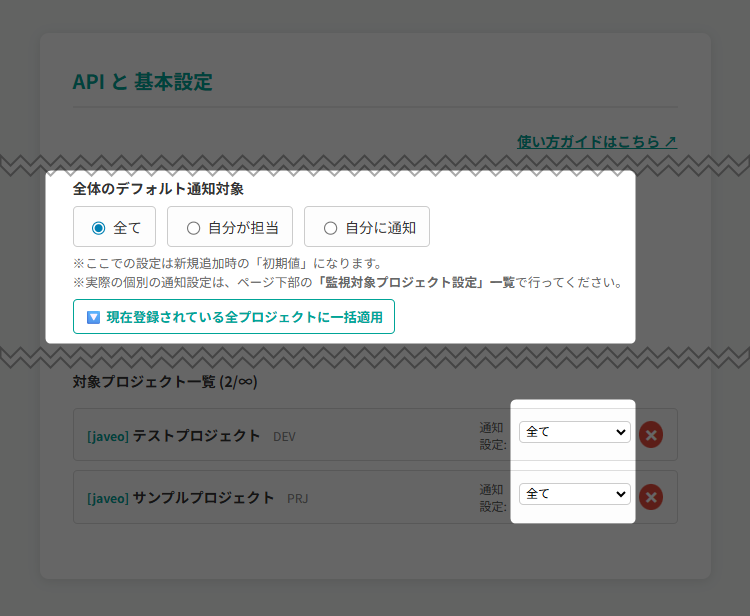 全体のデフォルト設定を持ちつつ、プロジェクト単位で個別に上書きできます。たとえば「メインプロジェクトは全て、サブで参加しているプロジェクトは自分に通知だけ」のような使い分けが可能です