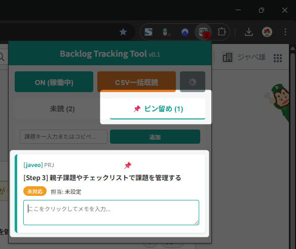 メモはカーソルを外した時点で自動保存されるので、保存ボタンを押す必要はありません。メモはこの拡張機能内のローカルデータベースだけに保存されるので、Backlog側には一切影響しません