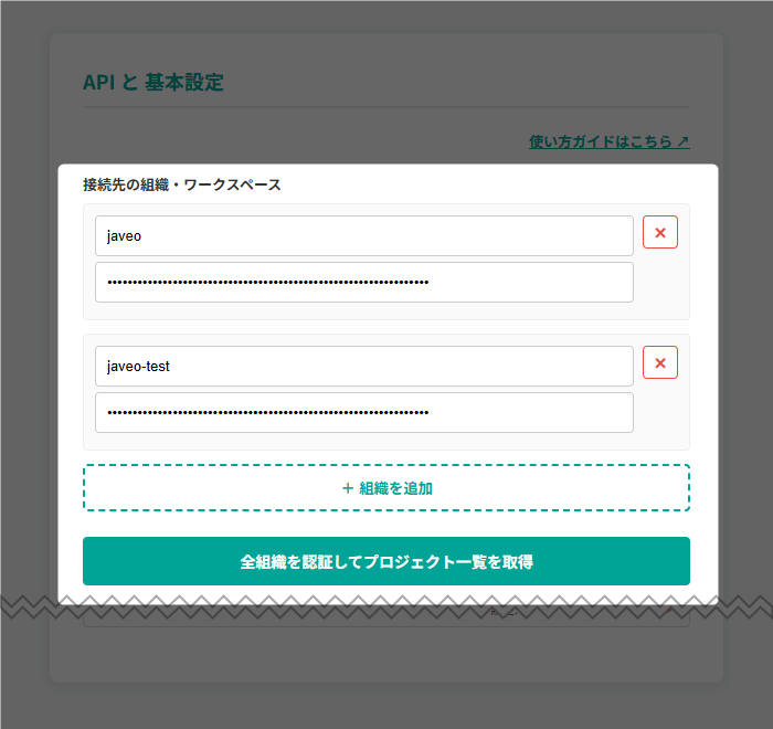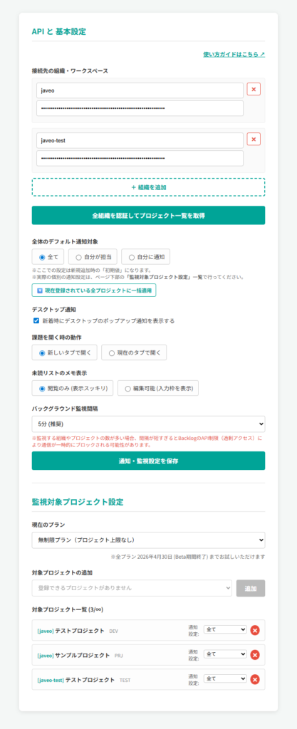Backlogのスペース名とAPIキーを入力して登録します。複数スペースの同時登録に対応しているので、自社のスペースとクライアントのスペースを同時に管理、なんてこともできます