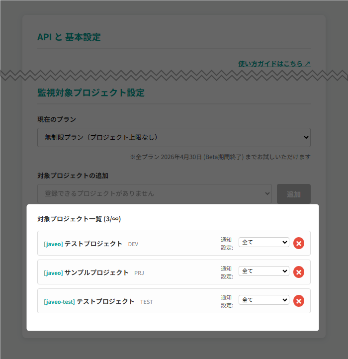 ワークスペースを登録すると、APIキーでアクセス権のある全プロジェクトが自動取得されます。その中から監視したいプロジェクトをプルダウンで選んで追加する仕組みです