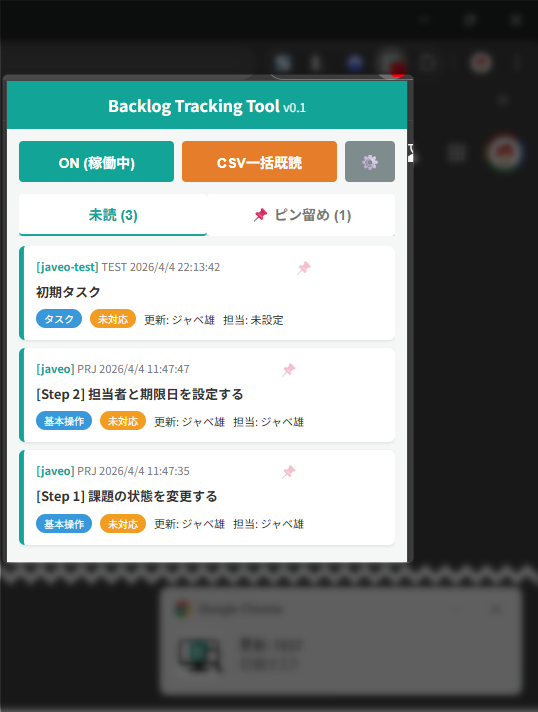 Backlog Tracking Tool は、複数のBacklogスペース(組織)にまたがる課題の更新情報をChromeのポップアップに集約し、「未読・既読」で管理できるChrome拡張機能です