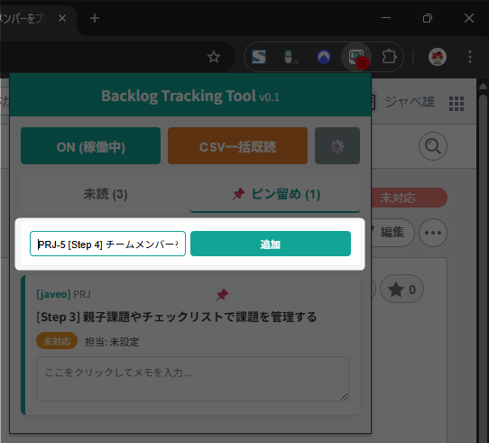 ピン留めの入力バーに、Backlog標準のコピー文字列(例: PROJ-123 ここに件名)をそのまま貼り付けるだけで手動追加できます。課題キーを自動判別して、紐づくワークスペースを探索・APIと通信してピン留めリストに追加してくれます