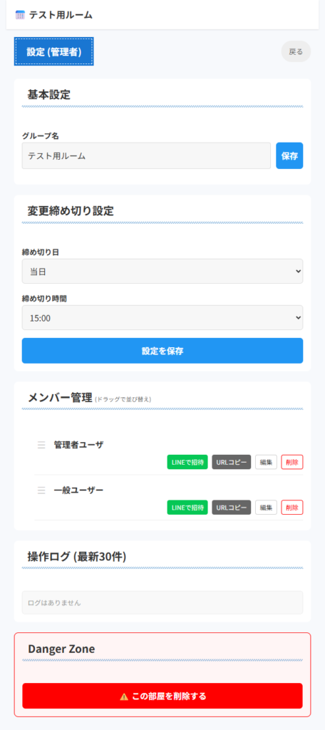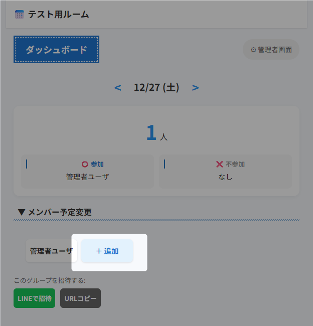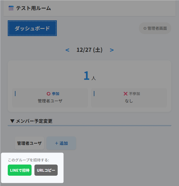 ダッシュボード(トップ画面)にある「LINEで招待」または「URLコピー」を使って、グループのURLをメンバーに共有してください。