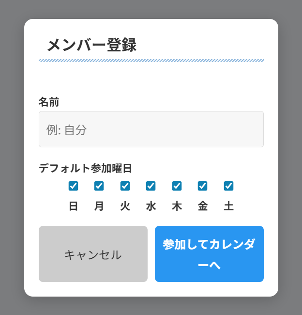 自分の名前と、基本的な参加曜日(デフォルト設定)を入力して登録します。