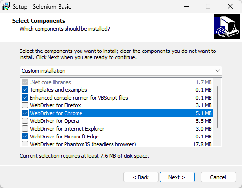 今は利用できないInternet ExplorerやPhantom JSのドライバーもありますが、インストールしただけで何か影響が出るわけでもないのでよくわからない人は初期値の”Full installation”でもいいし、無駄なものはインストールしたくない人は↓を選択しておけばOK